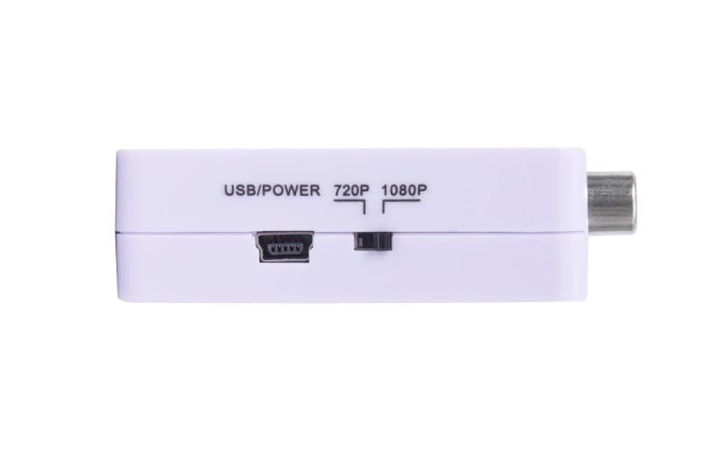 出力解像度は1080pと720pに対応し、本体側面の物理スイッチで切り替え可能。電源はUSB給電方式(5V/2.0A)で、PCのUSBポートやUSB充電器から手軽に電源供給が可能だとしている。なお、USB端子形状はミニUSBとなり、電源供給用USBケーブルが付属する。