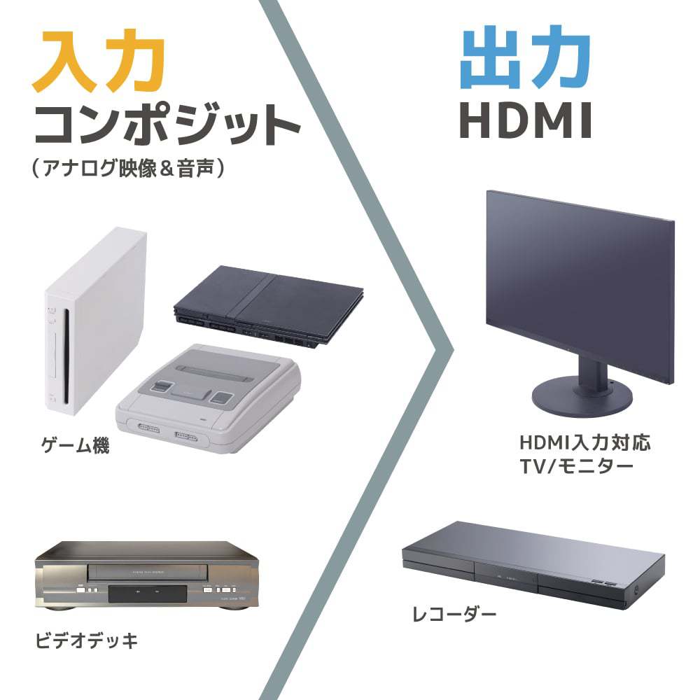 ビデオデッキやレトロゲーム機などのコンポジット映像信号およびステレオ音声信号をHDMI信号に変換できるアダプター。赤/白/黄のRCA入力の無い最近の映像機器でも、懐かしのビデオやゲームを接続して楽しむことができる。コンポジットケーブルとHDMIケーブルは別売となる。