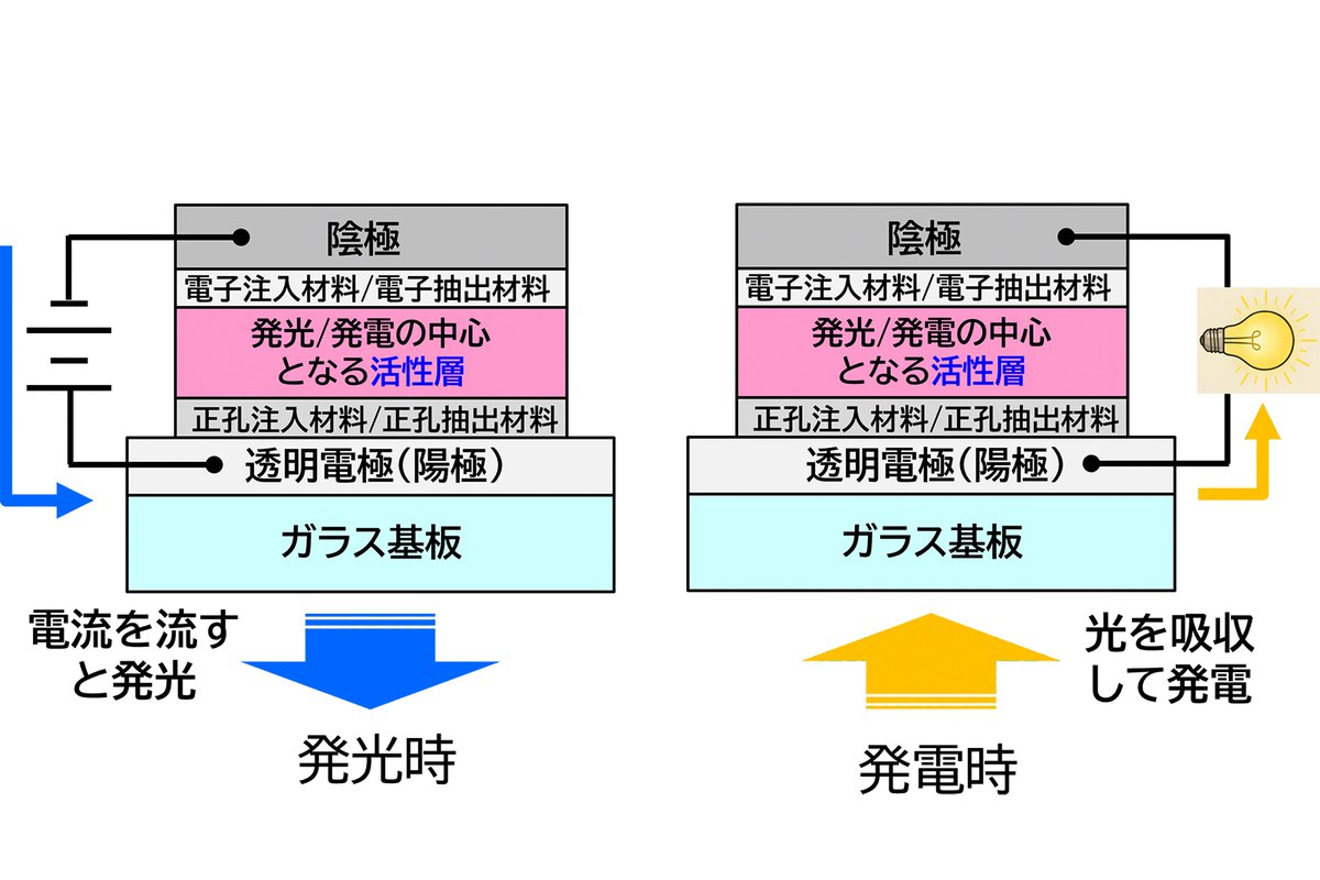 技研によれば、有機半導体に電気を与えて光を発する発光と、有機半導体に光を当てて電気を得る太陽光発電は逆の原理で動作するため、これまで2つの機能を1つの有機素子で両立することは困難とされていた。