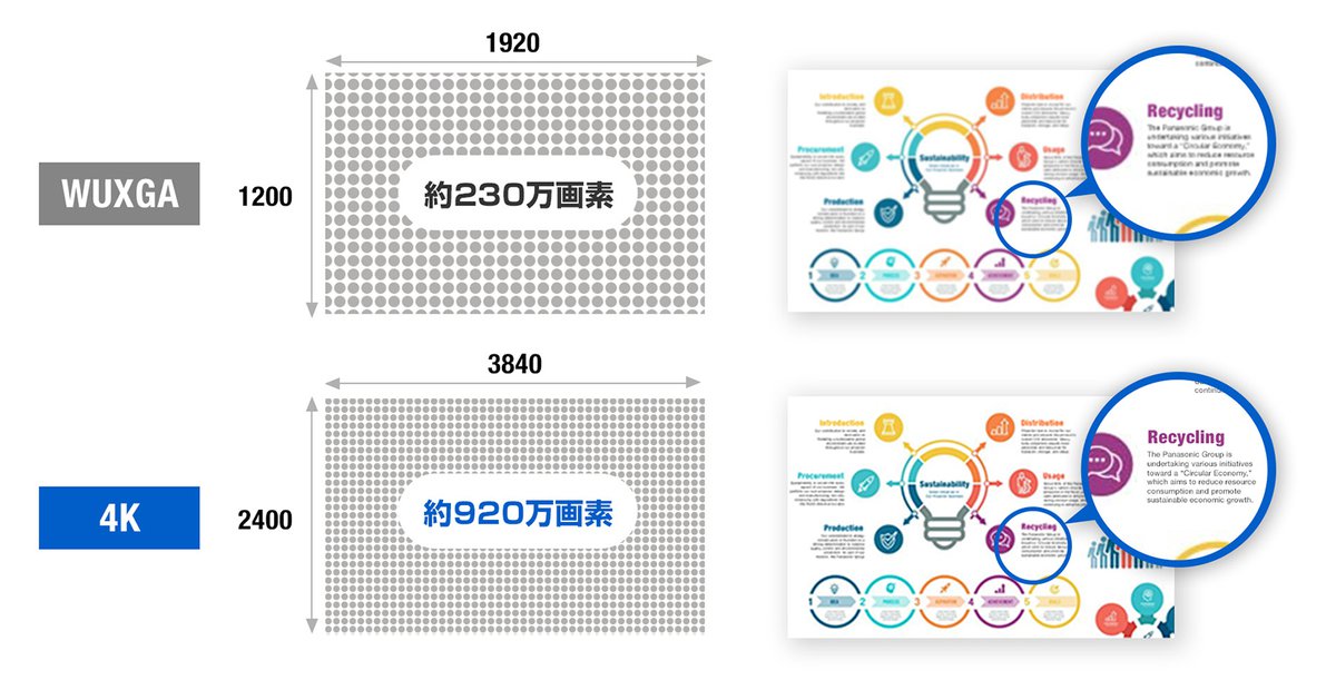特に上位モデルPT-VMQ85Jは輝度8,000lmを実現し、クラス世界最小/最軽量のボディで4Kと高輝度を両立したとアピール。PT-VMQ65Jも輝度6,500mlを実現している。その一方電力効率も高めており、少ない電力で明るい映像を投写可能。運用コストや環境負荷も抑えられると説明する。