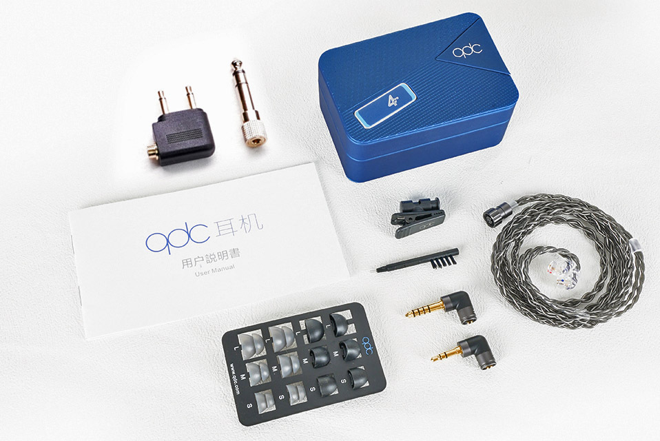 ほか付属品として、3.5mm to 6.35mm変換プラグ、qdc Tips Soft-fitシリコンイヤーピース(S/M/L 各3ペア)、シリコンダブルフランジイヤーピース(S/M/L 各3ペア)、フライトアダプター、ケーブルクリップ、クリーニングツール、オリジナルキャリングケースが用意される。
