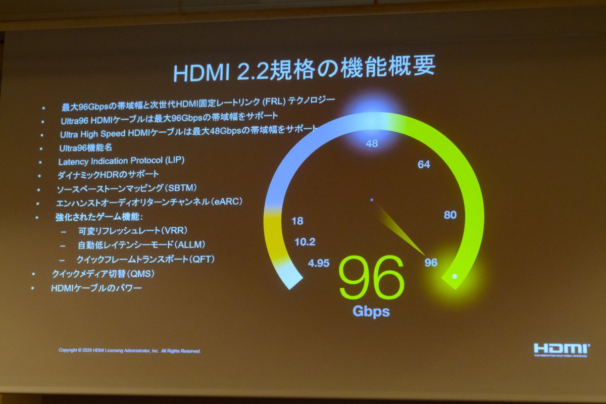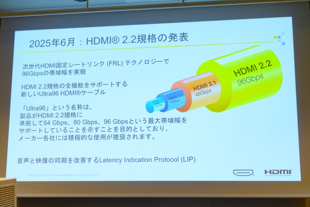 トバイアス氏はHDMI技術に関する直近のトピックとして、2025年6月に正式発表した「HDMI2.2」規格をあげる。