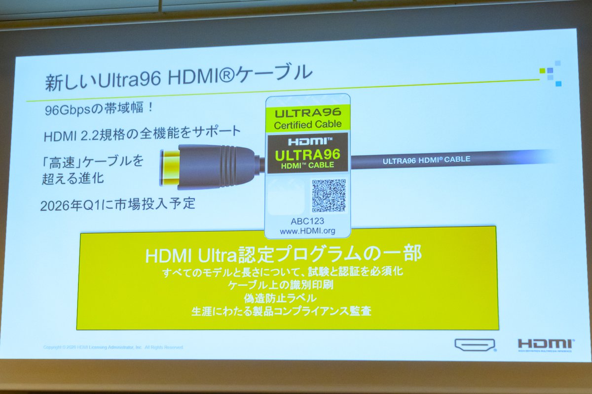 現在、認証テストのプログラムを策定する最終段階に入っており、策定されれば製品認証の手続きが開始。認証を受けたケーブルは、専用のラベルを貼付されて発売されることになる。早ければ、2026年第1四半期にもULTRA96 HDMIケーブルが市場に登場する見込みだそうだ。