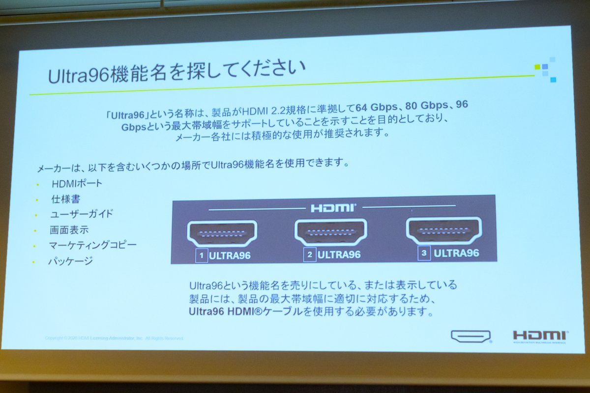 また、ULTRA96という名称は、最大96Gbpsをサポートすることを明示する手段としてHDMIポートや説明書、パッケージなどへの記載が認められており、「メーカー各社に積極的な使用を推奨する」とのこと。