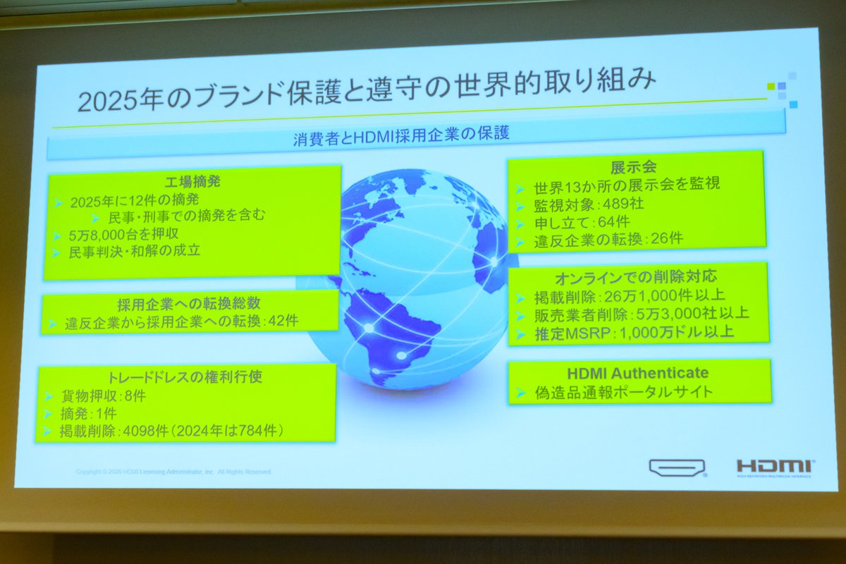 HDMI技術の革新とともに、HDMIブランドの保護にも力を注いでいるとトバイアス氏。「HDMI」という名称の使い方や、HDMI対応を掲げる製品がきちんと規格に準拠しているのかを厳しく監視することで、HDMI技術を利用するメーカーの企業価値も、製品を購入する消費者からの信頼も支えていきたいと述べた。