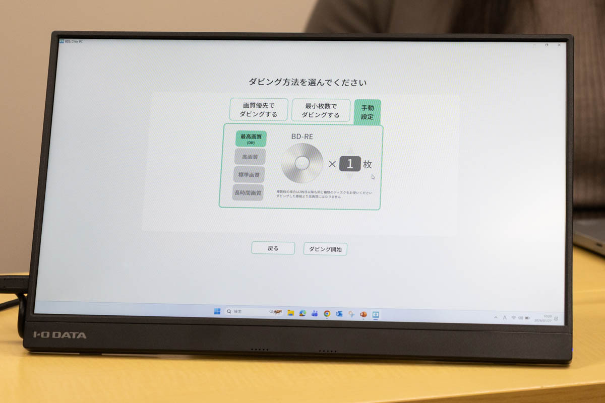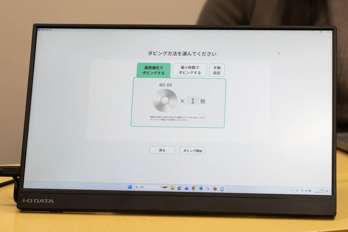 さらに、画質優先か、あるいは長時間録画優先か、コンテンツによってどのクオリティで残したいかという設定も、アプリ上から簡単に選択できる。例えばBD1層盤の場合は、最高画質では約2.5時間、長時間画質では約19時間録画可能。アプリ上で「画質優先でダビングする」あるいは「最少枚数でダビングする」から選択するか、さらに細かく手動で設定することもできる。