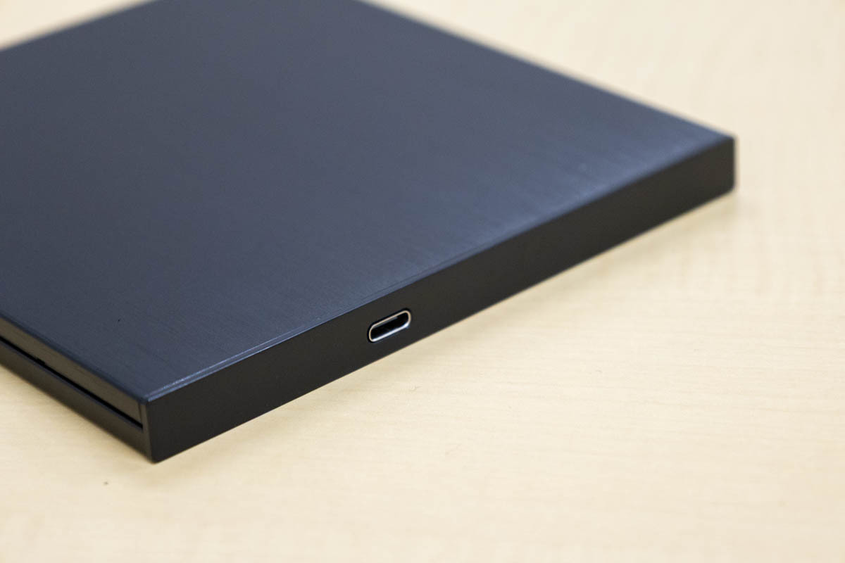 BDレコ本体はほぼCDジャケットサイズ、薄さも1cm程度とコンパクトで取り回しもしやすい。側面にUSB Type-C端子が設けられており、パソコンとUSBケーブルで接続するのみで使用できる。