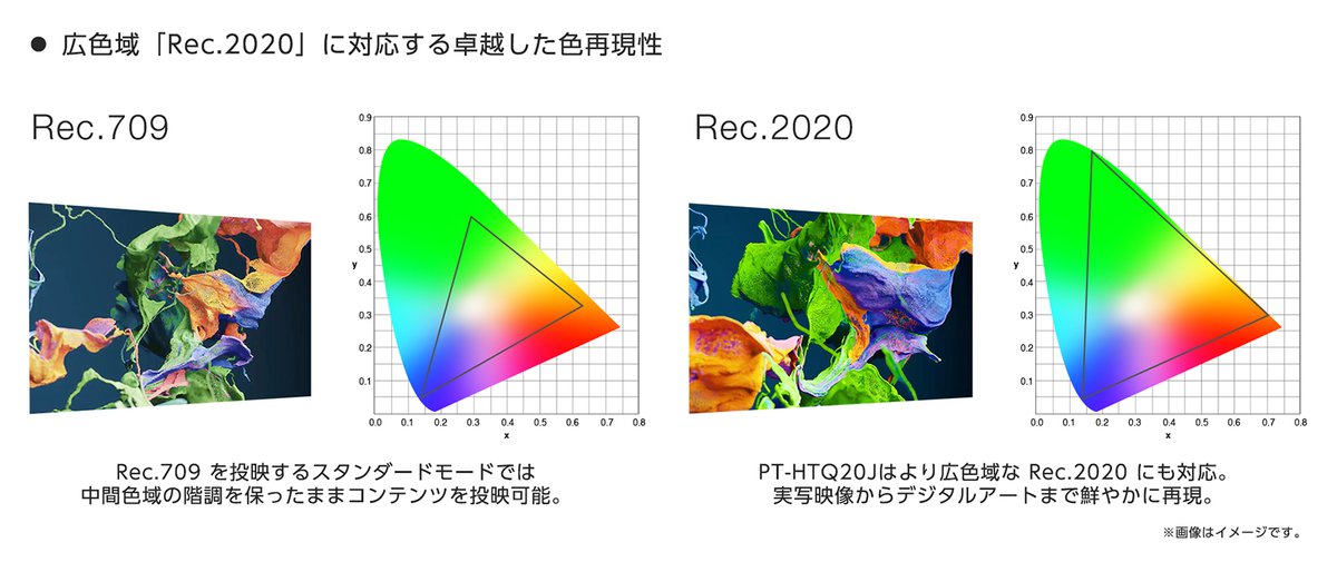従来コンテンツの主流であるRec.709色域での映像投写時も、RGBレーザーのみを使用するプロジェクターに比べ、中間色域の階調を保ったまま表示できるという。