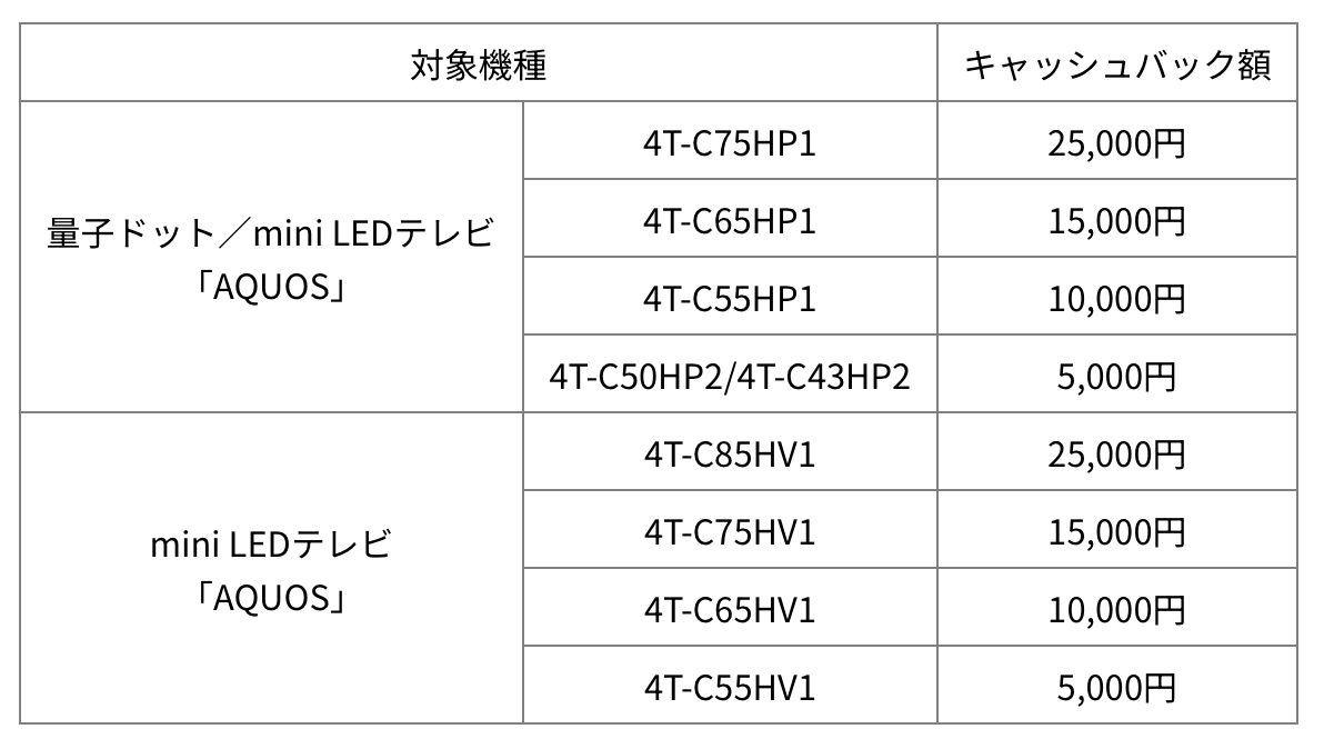 キャッシュバックキャンペーンは、2026年2月5日から3月31日までの間、対象のテレビ “AQUOS” を購入すると参加可能。特設サイトから応募することで、購入したモデルに応じて最大25,000円がキャッシュバックされる。