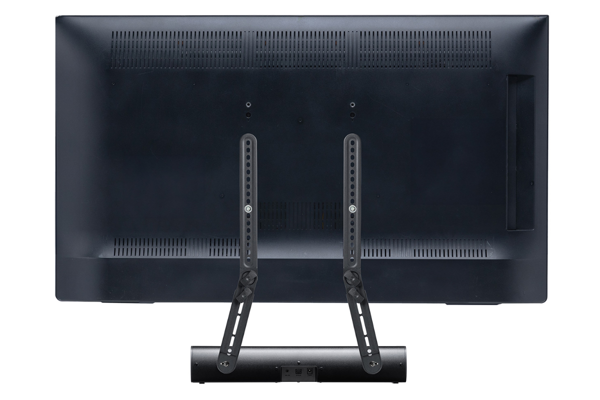 本製品は、テレビ背面のVESA穴を使って金具を固定し、その金具にサウンドバーを取り付けることで、テレビ台の上を占有せずにサウンドバーを設置できる点が特徴。