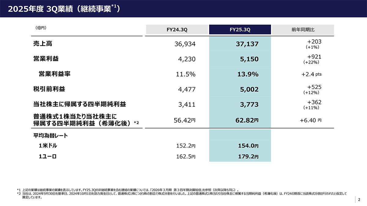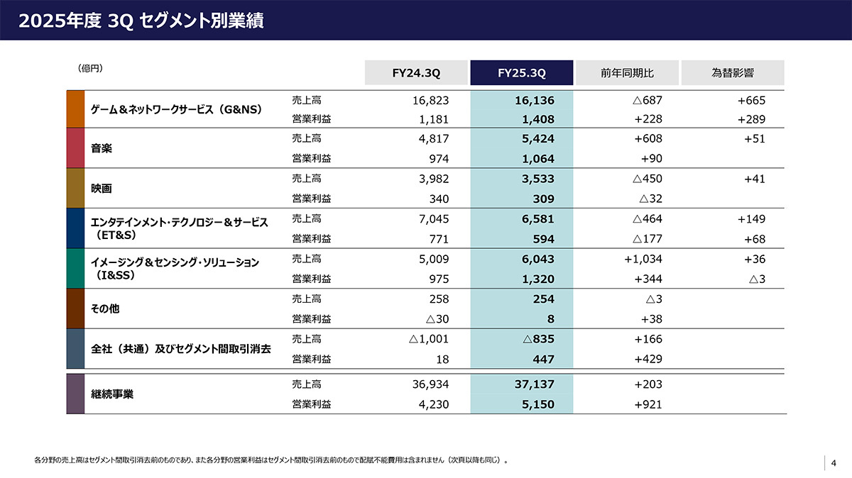四半期決算については、音楽分野やイメージング&センシング・ソリューション(I&SS)分野が牽引して前年同期比203億円増の売上高3兆7,137億円を記録。純利益として3,773億円(前年同期比362億円増)を計上した。
