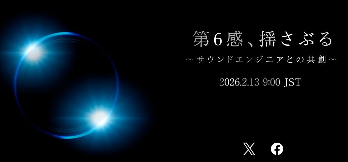ティザーサイトには、「第6感、揺さぶる 〜サウンドエンジニアとの共創〜」というキャッチコピーと、「2026.2.13 9:00 JST」という情報を記載。縁の2点が光っている円形の画像がそこに添えられている。