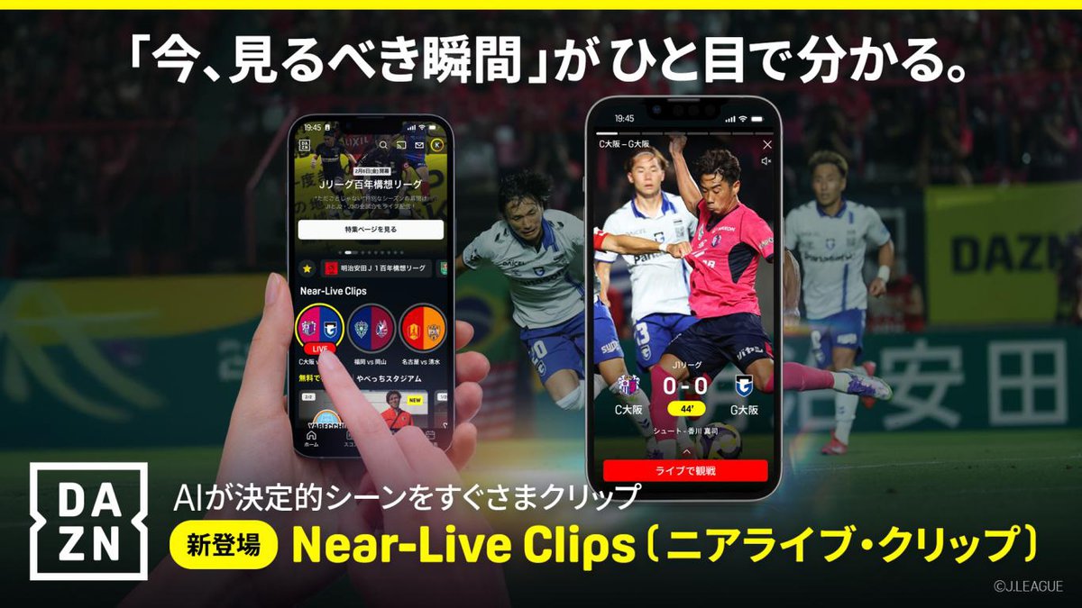 DAZNは、ライブ配信中の試合のハイライトシーンをAI技術を用いて切り出し、スマートフォン向けの縦型動画にする新機能「Near-Live Clips(ニアライブ・クリップ)」を提供開始した。