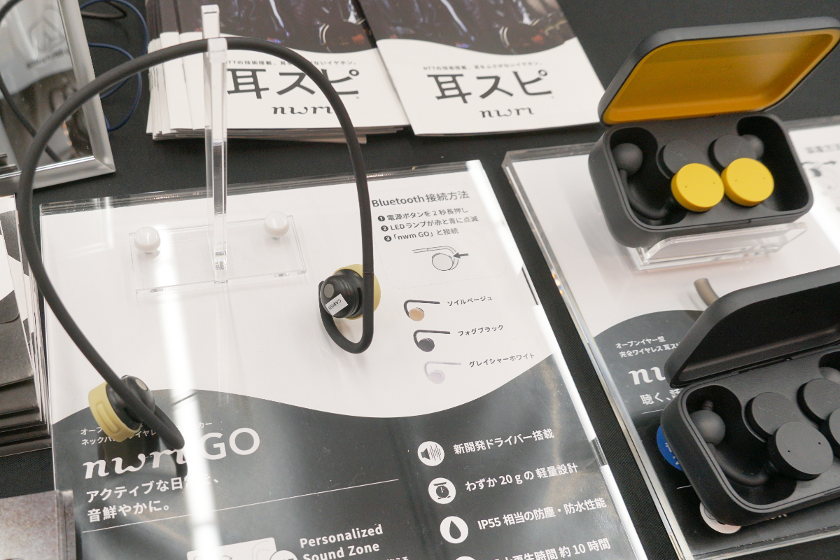 nwmブランドの“耳スピ”では、フラグシップのヘッドホン型「nwm ONE」、ネックバンド型「nwm GO」、完全ワイヤレスの「nwm DOTS」といった各種を用意。もちろん各モデルとも試聴が行えるようになっていた。