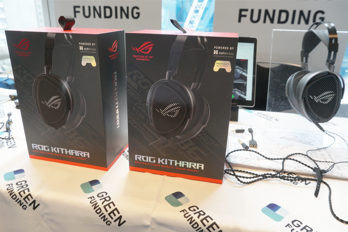 クラウドファンディングのプラットフォーム「GREEN FUNDING」のブースでは、ASUSのブランド「ROG」から、HIFIMANとのコラボによるゲーミングヘッドセット「ROG Kithara」を展示。同製品は「勝つための音」と「酔いしれる音」を両立したゲーミングヘッドセットとして位置付けられている。