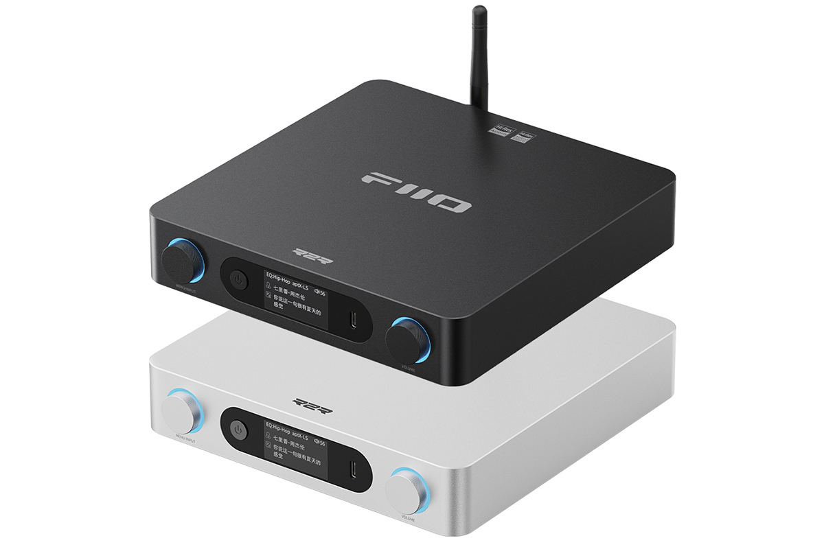 フロントパネルには、1.47型LCDディスプレイと2つのノブによるミニマルなインターフェースを配置。付属の赤外線リモコンやアプリ「FiiO Control」からの遠隔操作にも対応している。Bluetooth再生時、曲名やアーティストなどの情報に加え、デバイスのサンプリングレート、ボリューム、EQなどの情報もディスプレイから確認可能。