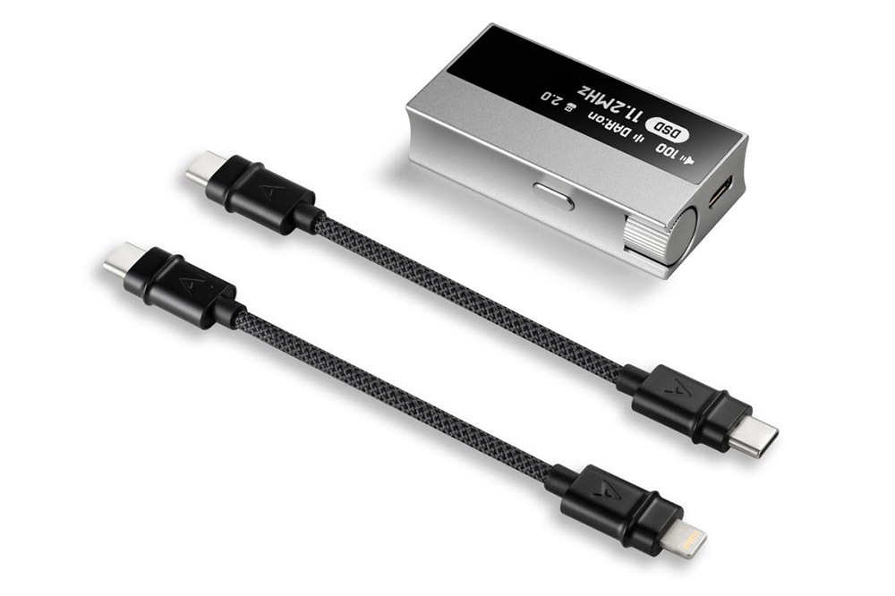 USB Type-Cケーブルは着脱可能な設計で、USB Type-C to CおよびUSB Type-C to Lightningの2本のショートケーブルが付属。ショートケーブルはアルミフィルムと編み込み錫メッキ銅のデュアルノイズシールドを施してノイズを遮断し、信号純度を高めている。