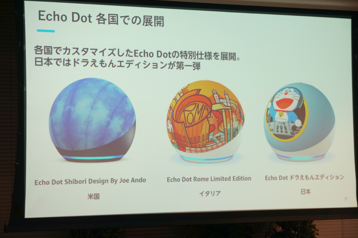 また、海外では国ごとに独自デザインのEcho Dotを展開しており、日本での第一弾として何を選ぶか議論した結果、人気キャラクターであるドラえもんを採用したという。
