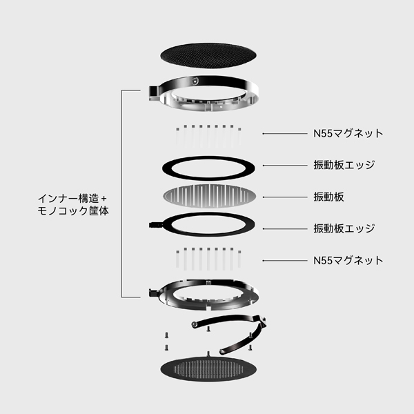 これにより分割振動を大幅に抑制し、一般的な平面磁界ヘッドホンを凌駕する繊細な高域再生が可能だとアピールする。