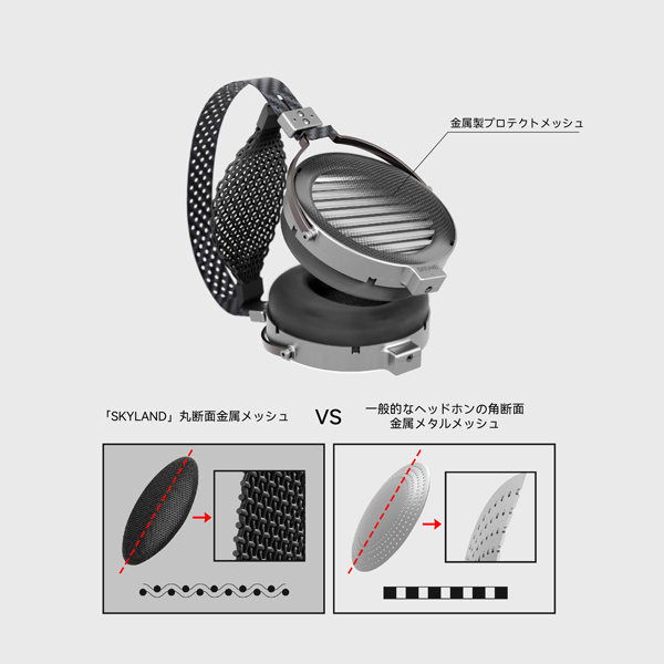 振動板の保護には、滑らかな金属ワイヤーを疎に編み込んだ金属製プロテクトメッシュを採用。開放的なサウンドを損なうことなく、振動板の損傷を防止する。