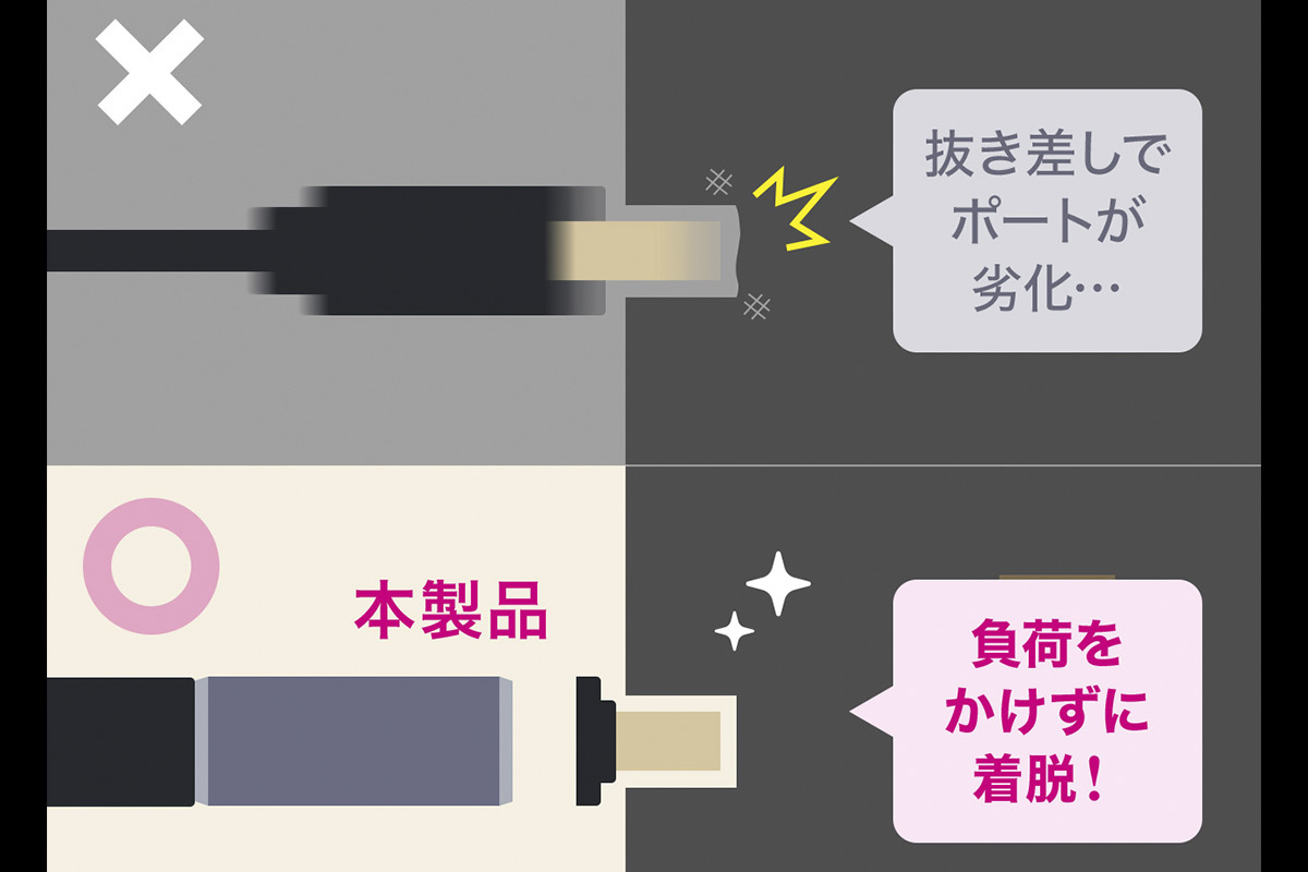 機器側オス端子とケーブル側メス端子がマグネットで着脱できる仕様になっており、テレビ裏やラック内など手が入りにくい場所でも近づけるだけで簡単接続できるとアピール。また、オス端子を機器に残したまま抜き差しができるため、HDMIケーブルを頻繁に抜き差しする場面でも端子の劣化を抑制することができるという。