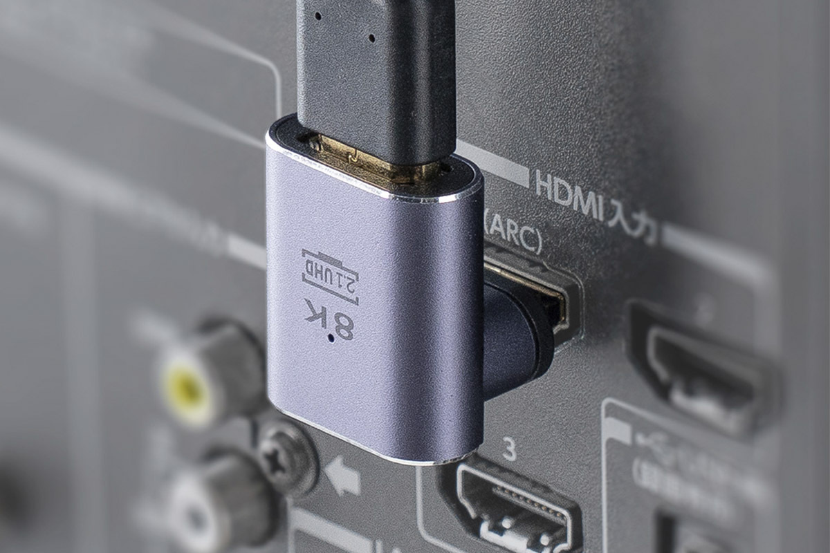 本機は下向き/直線/上向きの3タイプをラインナップし、設置状況に合わせて最適な向きを選択できる。壁掛けテレビやサウンドバーから配線する場合でも適切な向きのコネクターを組み合わせることで、折れ曲がりによる端子やケーブルの負荷を軽減するとのこと。