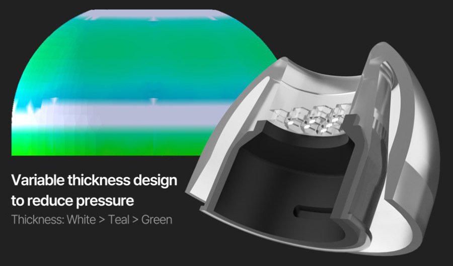 2つ目の新技術は「可変厚設計」。AZLAがこれまで採用していた、イヤーピースの傘の厚みを先端に向かって薄くする「テーパード構造設計」を進化させたもので、イヤーピースの先端以外の部分でも厚み調整を可能にしている。これにより、耳にかかる圧迫感をより一層低減しつつ、密閉性/遮音性も高めたという。