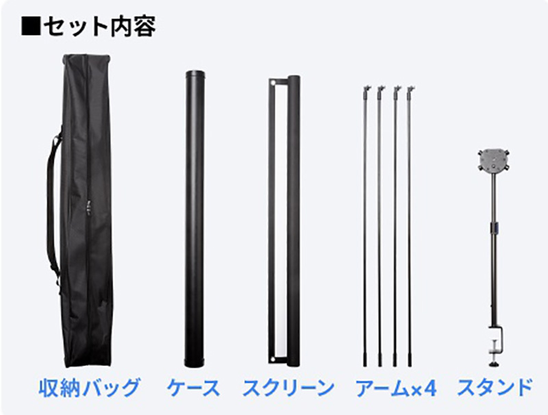 外形寸法は展開時1,821W×1,350H×50Dmm、1,090W×110H×170Dmm。質量は3.85kg。クランプ付きスタンドや展開用アームなどが付属する。