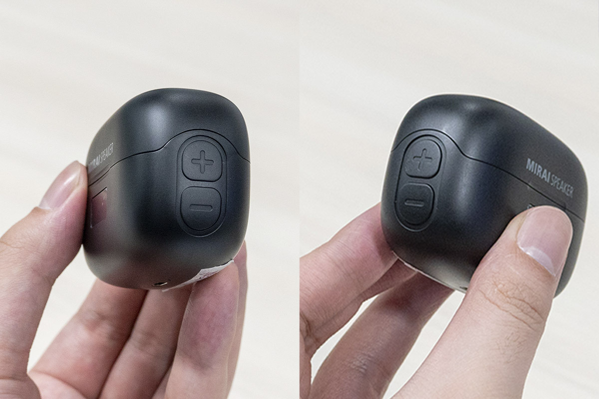 ミライスピーカー・イヤーの充電ケースのみの仕様として、最大約10mまで離れた場所の音声をイヤホン本体にBluetoothで伝送する集音マイクを搭載する。テレビの近くに置いてテレビ音声を聞き取りやすくしたり、テーブルの中心に置いてグループでの会話を聞きやすくするといった活用ができるとのこと。