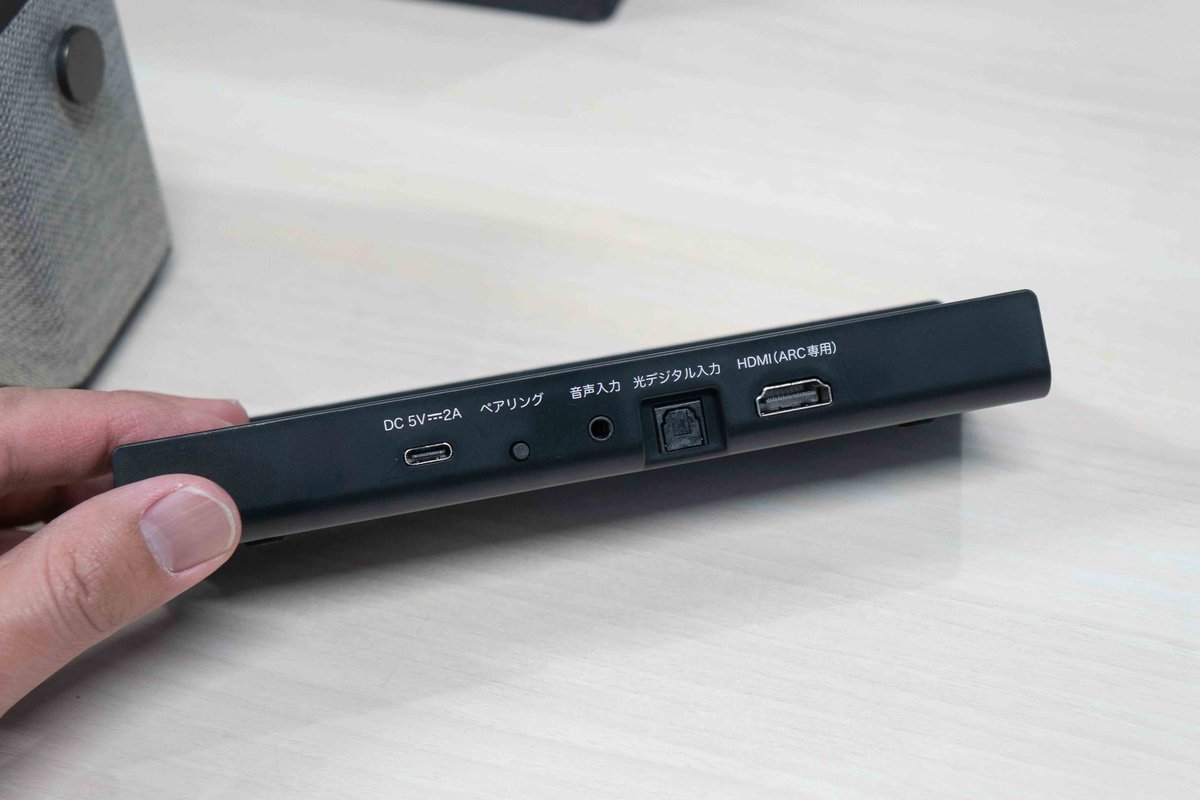 テレビ音声はベースユニットを介してスピーカー本体に伝送。ベースユニットはHDMI(ARC)入力、光デジタル音声入力、3.5mmアナログ音声入力に対応。ユニットから本体への伝送は、2.4GHz帯デジタルワイヤレス方式とのことだ。