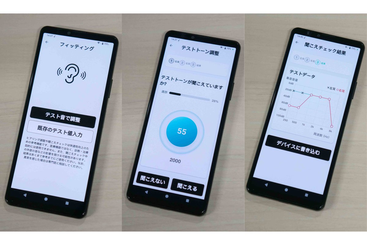そのほか操作面では、ミライスピーカー・イヤーのみ専用アプリからの操作や調整に対応。自動音場補正機能の「聞こえチェック」では、各帯域のテストパターンを再生し、使用者がどこまで音が聞こえるかをテスト。そのデータを基に、“聞こえ”方をパーソナライズ化する機能を備えている。こちらも上位機種のみ採用。