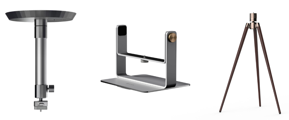 専用スクリーンは、自然でバランスの取れた映像表現と広視野角を特徴とするマットホワイトスクリーンと、環境光を最大85%抑制し、明るい部屋でも高コントラスト映像を楽しめるフレネルALRスクリーンの2種類を用意する。設置用アクセサリーは、天井取付マウント、デスクトップジンバルスタンド、ウォールナットフロアスタンドをそろえる。