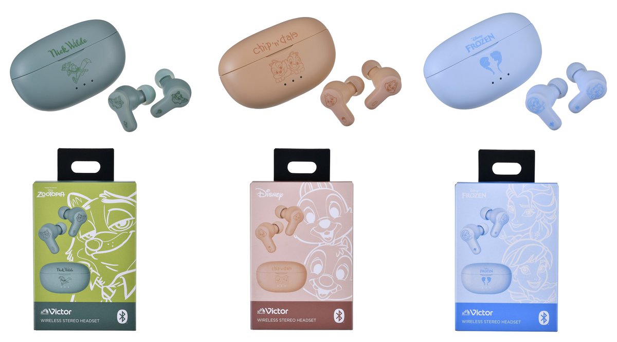 JVCケンウッドは、Victorブランドとディズニーストアとの共同企画第3弾として、完全ワイヤレスイヤホン「HA-A20T」の「ニック」「チップ&デール」「アナとエルサ」デザインモデルを、3月20日(金)から発売する。