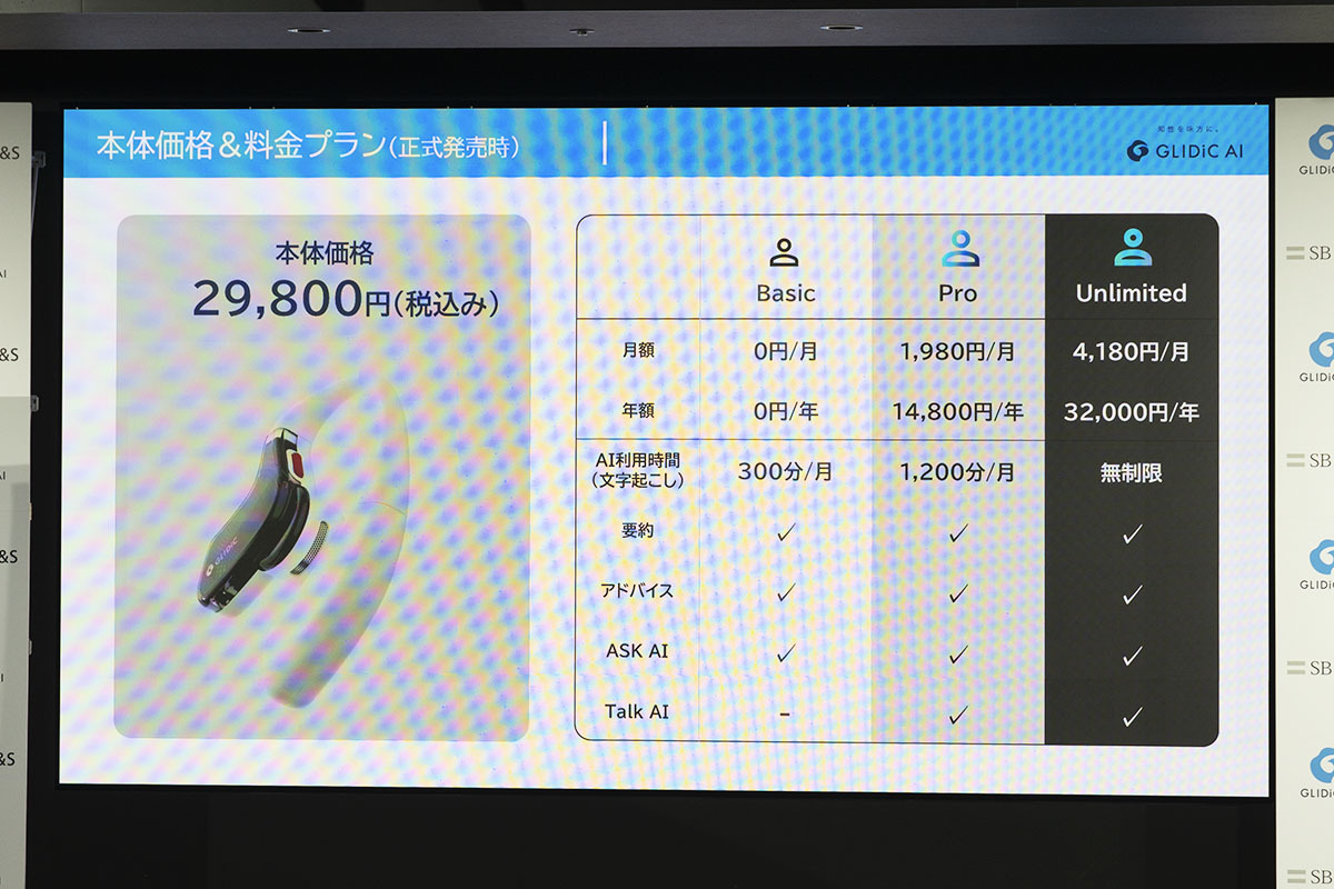 GLIDiC AI +uBudsは、AI利用可能時間や機能ごとに3種類のプランを用意。無料の「Basicプラン」はAI利用可能時間が毎月300分、月額1,980円の「Proプラン」ではAI利用可能時間が毎月1,200分で「Talk AI」機能が使用可能となる。月額4,180円の「Unlimitedプラン」ではAI利用可能時間が無制限ですべての機能を利用できる。