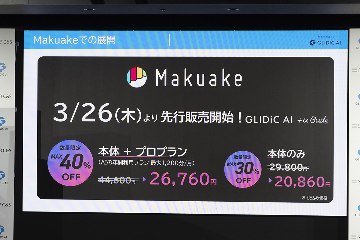 SB C&Sは、新たに立ち上げたAIプロダクトブランド「GLIDiC AI(グライディック エーアイ)」から、第1弾として次世代AIを搭載した完全ワイヤレスイヤホン「GLIDiC AI +uBuds」を発表。3月26日(木)より応援購入サービス「Makuake」にて先行発売する。本体価格は29,800円(税込)。