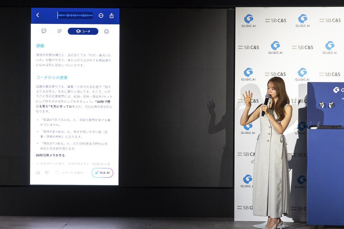 「最近ハマっていること」をテーマとしたインタビューを録音したデータをもとに、AIによるアドバイスのデモでは、受け答えの仕方や今後のインタビューに向けた助言に、「イヤホンの域を超えている。ユーザーの立場や文脈を認識した要約からアドバイスを行ってもらえて便利」と絶賛。仕事の打ち合わせでも活用したいそうで、「専属の頭の中のコーチ」と一言で表して締め括った。