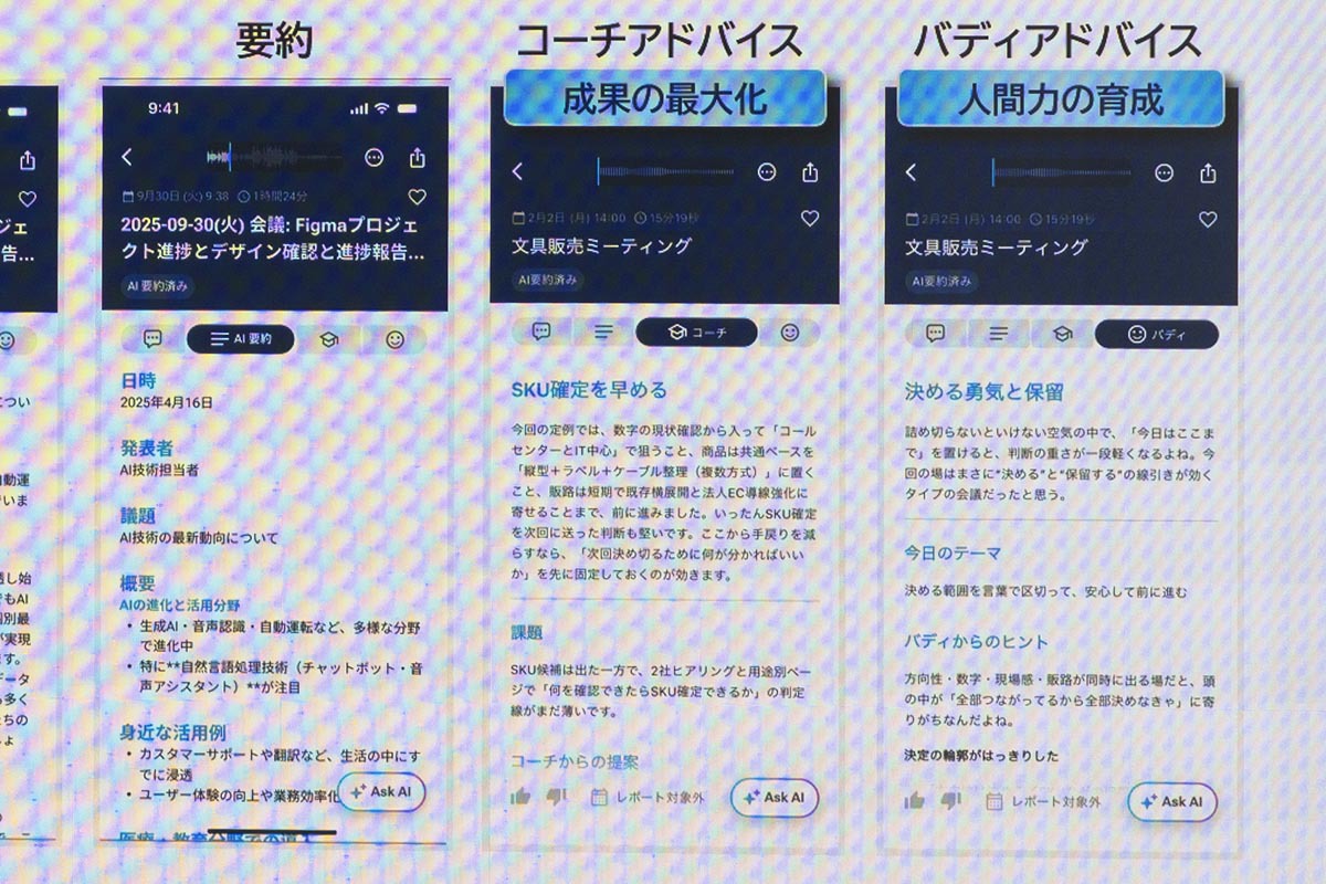 また、AI学習にユーザーの音声データを使用しないことでプライバシーにも配慮。AI学習の対象となるのは集積した録音や要約の内容、アドバイスの内容とその効果のフィードバックに限られるとのこと。