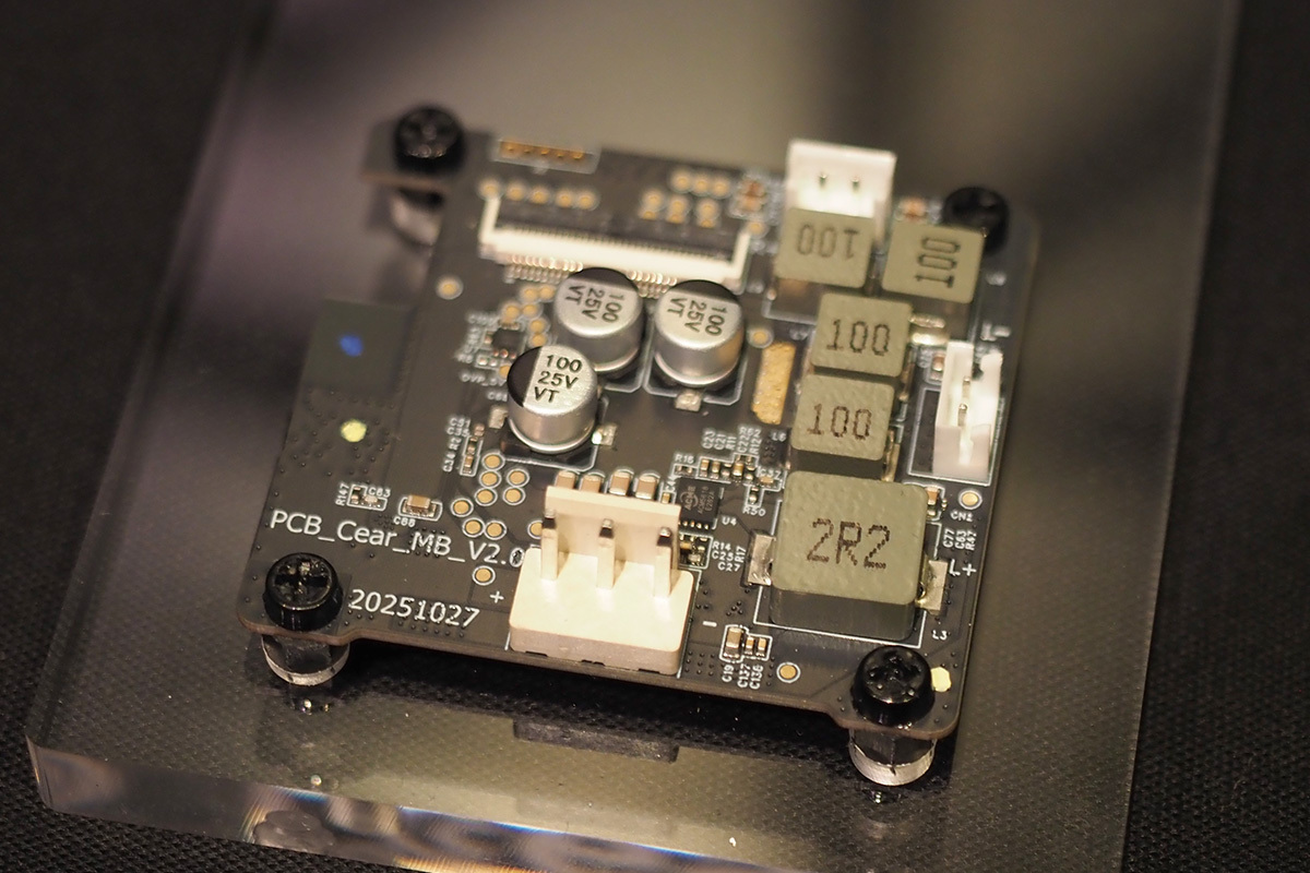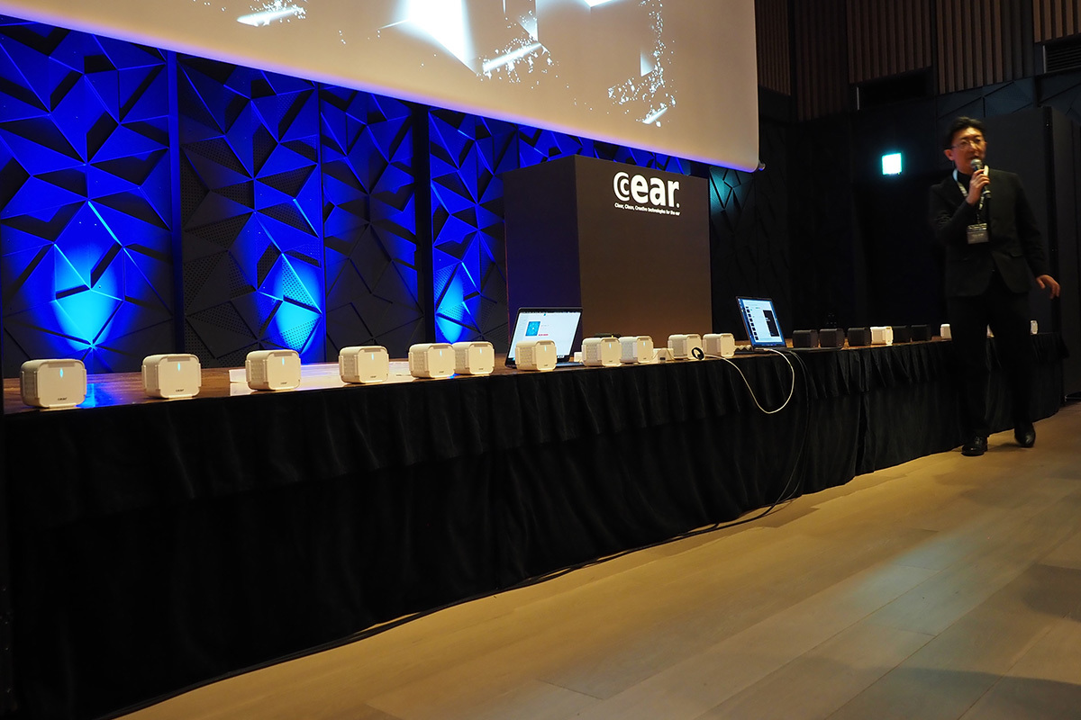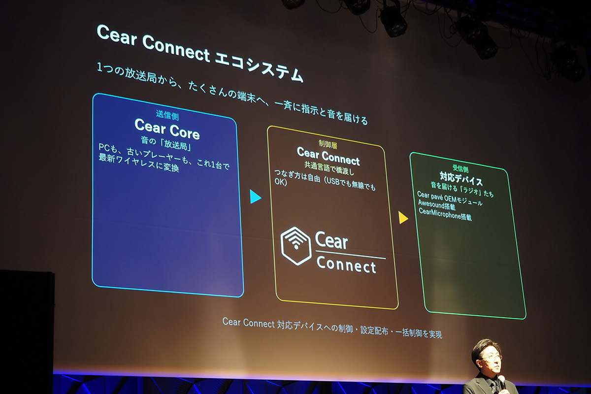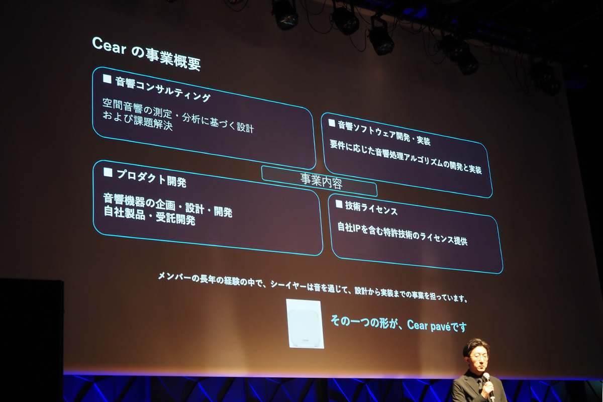 特にコンシューマー向けにおいては、2024年にBluetoothスピーカー「Cear pave」を一般販売。ステレオ音源をリアルタイムで解析し、リアルな音場感を付与する独自の空間立体音響技術「Cear Field」を搭載するなど、独自の音響技術を活かした展開を行なっている。