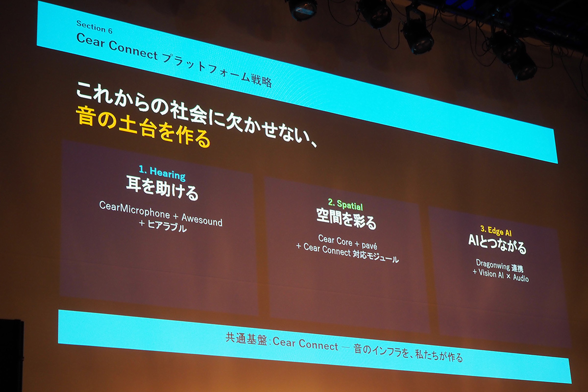 Cear Connectプラットフォームの戦略として、「耳を助ける」ヒアリング、「空間を彩る」スペシャル、「AIと繋がる」Edge AIの3つの土台を挙げて、それぞれに対するアプローチについて説明した。