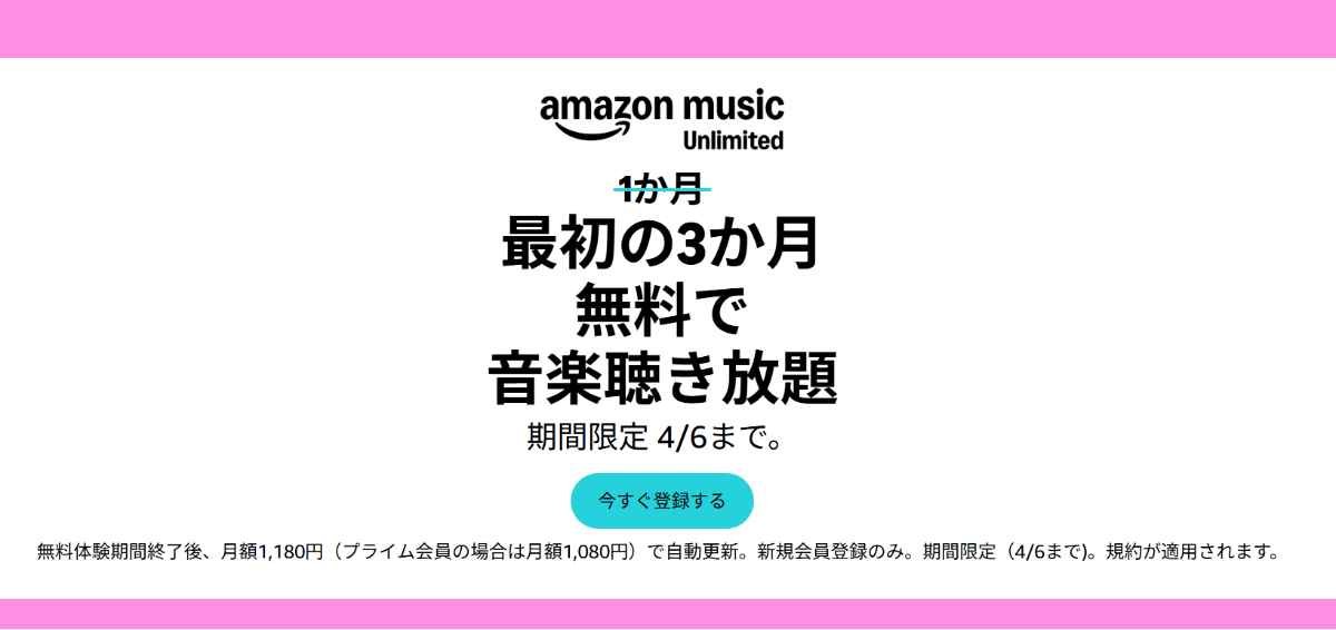 Amazon Music Unlimited 3ヶ月無料キャンペーン。4/6まで