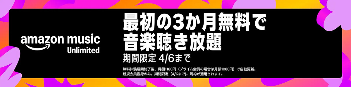 Amazonの大型セール「新生活セールFinal」が本日4月6日(月)23時59分で終了となるが、音楽配信サービス「Amazon Music Unlimited」の月額の個人プランが、新規会員登録者を対象に最初の3か月が無料になるキャンペーンも本日が最終日となっている。Amazon Music Unlimitedは、1億曲の楽曲とポッドキャストが聴き放題となる音楽配信サービス。広告なしで楽しめるほか、オフライン再生にも対応する。また、ハイレゾ/ロスレス配信も提供。オーディオブックサービス「Audible」も毎月1冊聴くことができる。料金は月額1,180円(税込)。プライム会員は月額1,080円(税込)。