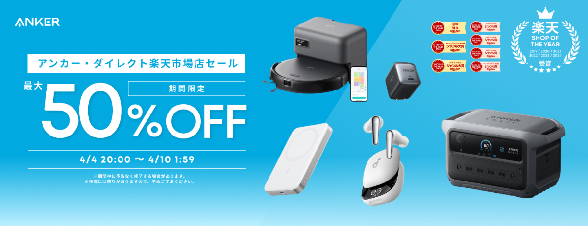 Ankerは楽天市場の公式ショップにて、対象製品が最大50%になる期間限定セールを実施中。期間は4月10日(金) 午前1時59分まで。