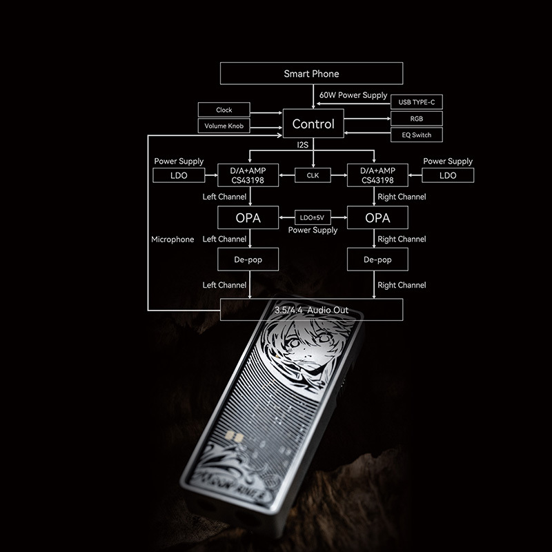 CLKチップを合わせた5基の独立電源チップで各回路に対して個別に電力を供給し、極めてクリーンな音質を実現するとしている。出力は4.4mmバランス接続時の16Ω負荷で最大4Vrms/500mW。