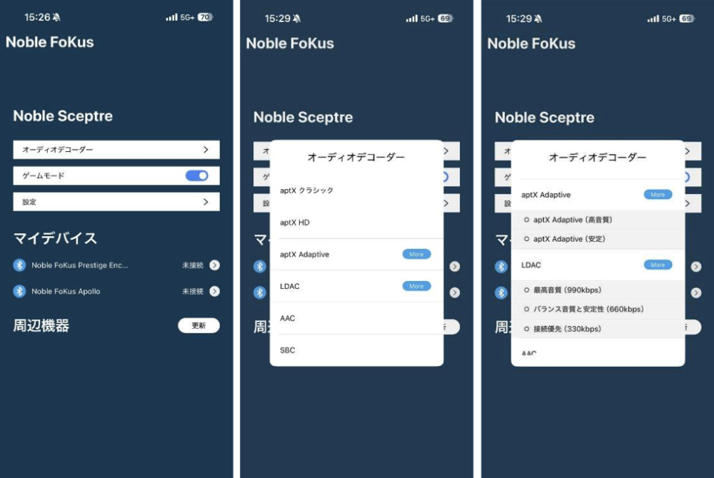 セットアップやコーデック変更、ゲームモードの切り替えは、iOS/Android向けアプリ「Noble FoKus」から行える。一度初期設定を済ませれば、その後は対応するUSB-Cデバイスで使用可能。ゲームモードを有効にすると、家庭用ゲーム機でも高品位Bluetoothオーディオを利用できるという。