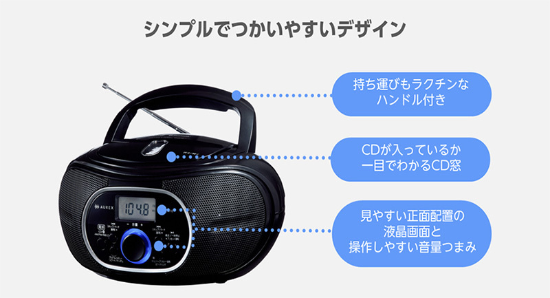 CD再生機能は、1曲/全曲リピート再生、最大20曲まで好きな曲を繰り返し再生するプログラ再生(リピート対応)、ランダム再生を搭載。ラジオ再生は、AM放送およびワイドFMの受信に対応する。