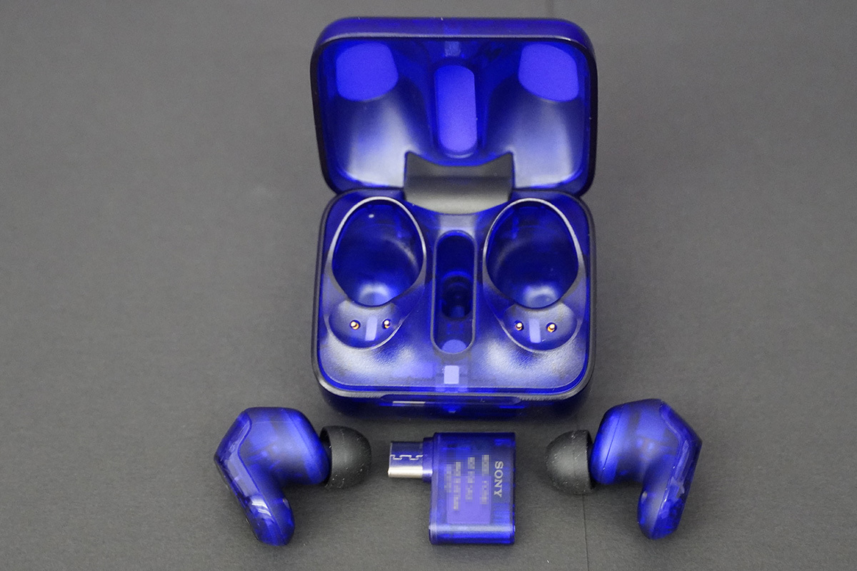INZONE Budsは、既存色のホワイトとブラックに加えて、新色グラスパープルにより、計3色のラインナップに。グラスパープルにはスケルトンデザインが採用され、2.4GHz通信を実現するUSB Type-C接続の専用ドングル(トランスミッター)も新色仕様になっている。
