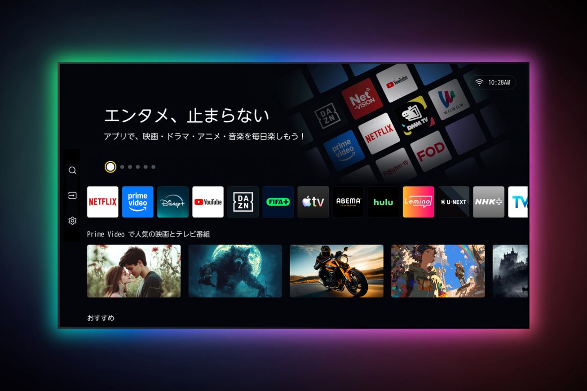 OSは前モデルから引き続き「VIDAA OS」を踏襲。VODサービスは、YouTube/Prime Video/Netflix/Apple TV/Disney+/U-NEXT/TVer/ABEMA/NHK+/DAZN/hulu/Lemino/WOWOWオンデマンド/FOD/Rakuten TV/FIFA+/FOD/BANDAI CHANNELがプリインストールされている。