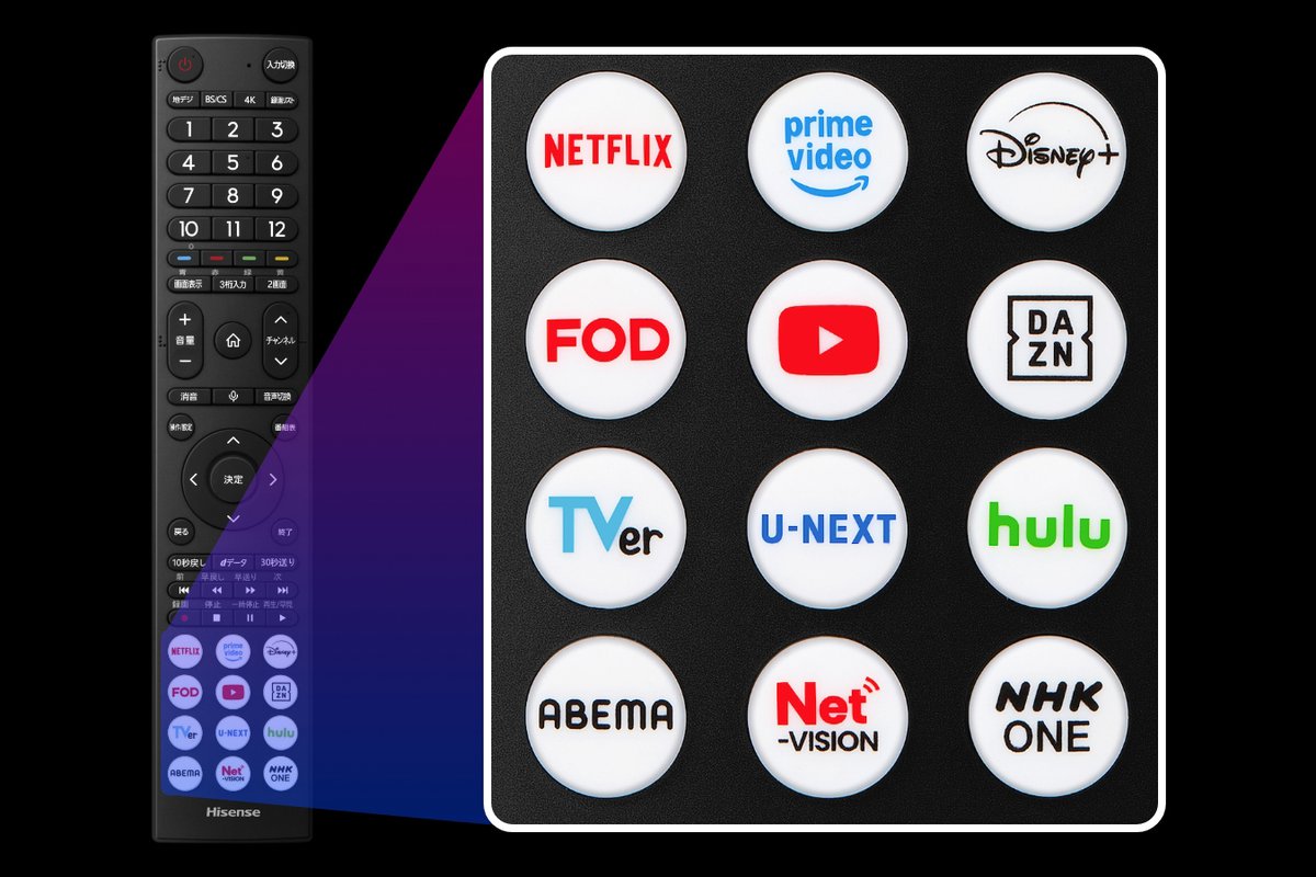 付属リモコンには、VODサービスをすぐに立ち上げられる12個のダイレクトボタン、音声操作を可能にする「VIDAA VOICE ハンズフリー」ボタンが設置。ワイヤレス機能は、Wi-Fi 6やAir Play 2、Bluetoothが使用できる。