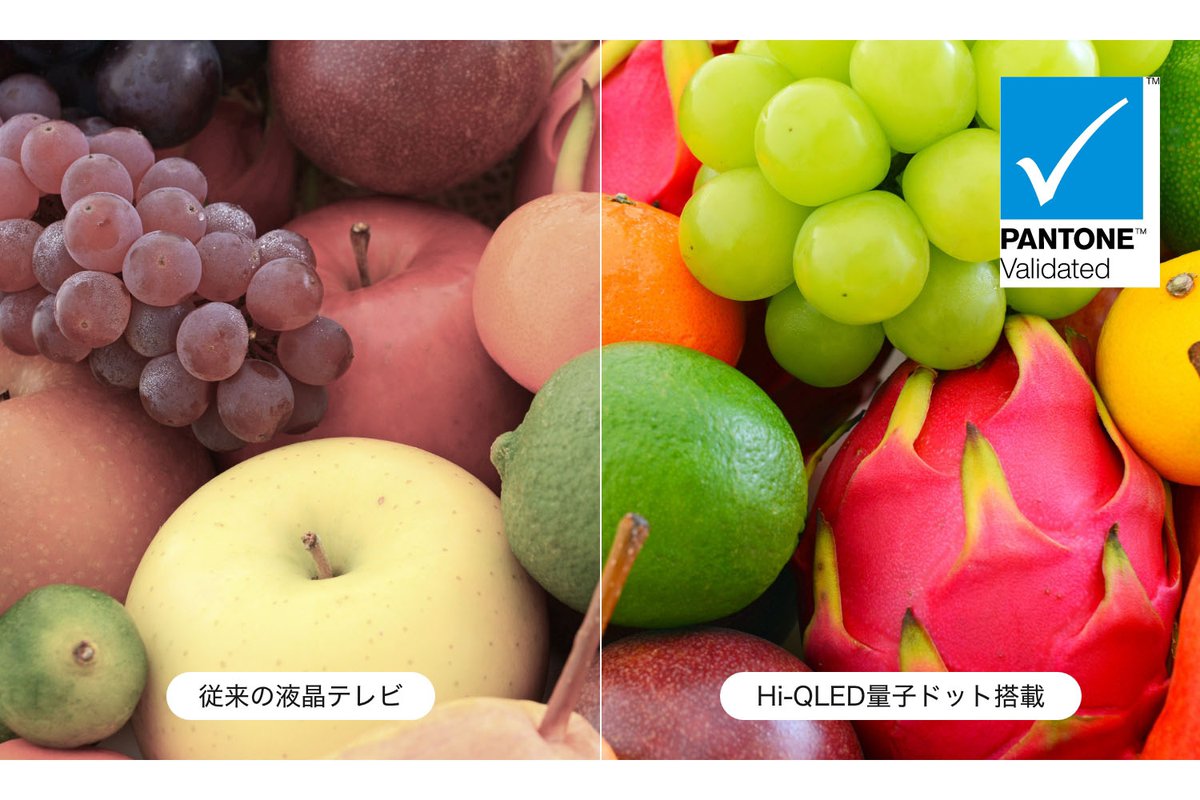 加えて、広色域技術「Hi-QLED量子ドット」を搭載。純度の高い色再現を可能としており、Pantone認証のリアルな色彩表現も成し得ている。100型から65型までは「広視野角パネル」、55型は「高コントラストパネル」を導入し、さまざまな角度から見ても色抜けの無い映像を実現。視野角は178°をマークする。