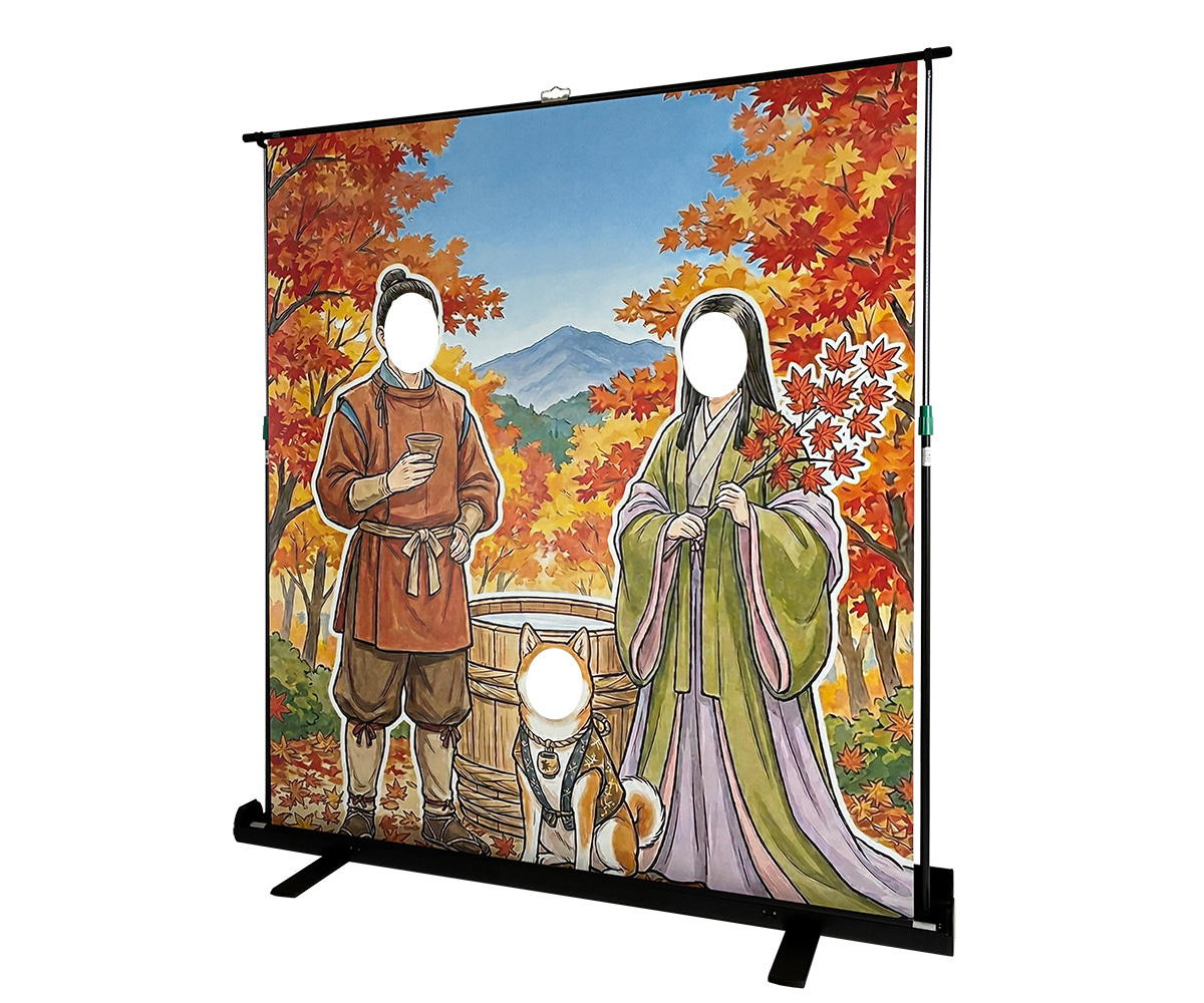 記念撮影の顔出しパネルを巻取り式スクリーン化。オーエス「フロアスタンドメモリアルスクリーン」